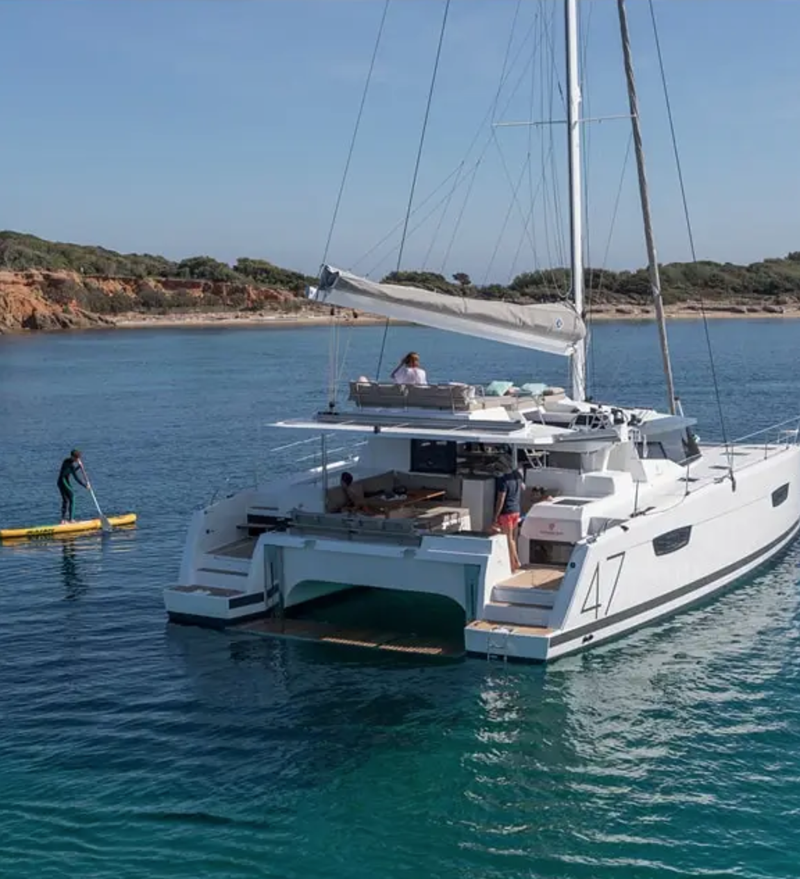 At the heart of the experience is the SAONA 47, a modern premium catamaran built in 2020. Hosting a maximum of eight riders alongside two crew members, it offers the perfect balance of comfort, space and mobility—allowing you to chase the best wind every day.